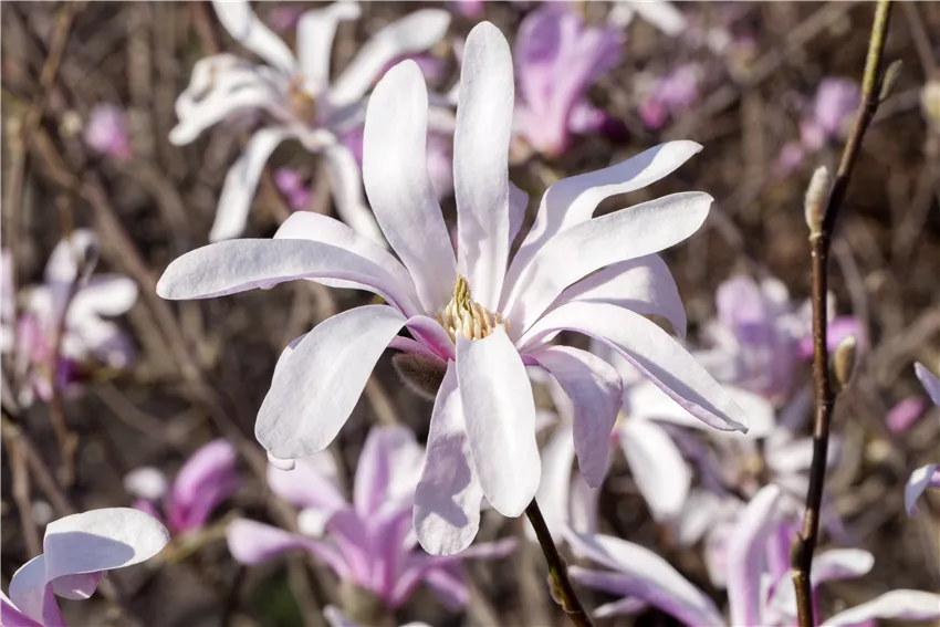 Was Magnolien so besonders macht? Das ist wahrscheinlich vor allem ihr Aussehen, denn das sorgt bei vielen Pflanzenfreunden für strahlende Augen. Die besonderen Blüten und der malerische Wuchs sind eine echte Bereicherung für jedes Gartenkonzept und auch auf dem Balkon oder der Dachterrasse sind die frühblühenden Gehölze gerne gesehen. Magnolien gibt es mit den unterschiedlichsten Blütenformen und -farben und wer die Gehölze geschickt im Garten integriert, kann sich bis in den Sommer hinein an den beeindruckenden Blüten erfreuen. Während die Stern-Magnolie im März den Anfang macht und ihre strahlenden sternförmigen Blüten zeigt, kann man mit der Sommer-Magnolie bis zum Juni die beeindruckende Blütenpracht genießen. Dabei gibt es diese Blüten in den unterschiedlichsten Farben von reinem Weiß, über Rosa und Pink, bis hin zu Rot und Gelb. Der Fantasie bei der Gestaltung sind keine Grenzen gesetzt und mit den passenden Begleitern kann man sich den Frühling farbenfroh und bunt in den eigenen Garten holen. Die Stern-Magnolie ist es auch, die bei ausreichender Bewässerung und dem passenden Standort auch für die Haltung im Kübel geeignet ist und damit auch auf der Terrasse, auf dem Balkon oder auf der Dachterrasse eine sehr gute Figur macht.