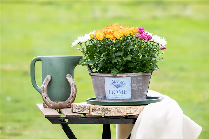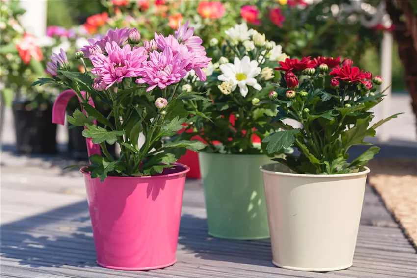 Damit sich die Blühwunder im Garten und auf dem Balkon auch so richtig wohlfühlen können, kommt es auf den richtigen Standort und die optimalen Bedingungen an. Die zu erfüllen ist aber nicht schwer, denn Chrysanthemen sind robust, pflegeleicht und nicht besonders anspruchsvoll. An einem sonnigen Standort fühlen sich die Schönheiten besonders wohl und werden dort viele bunte Blüten ausbilden. Ein nährstoffreicher Boden ist entscheidend für ein gesundes und kräftiges Wachstum. Durchlässig und locker sollte der Boden aber auch sein, denn mit zu feuchter Erde kommen Chrysanthemen nicht gut zurecht. Für eine gute Drainage kann Kies oder Sand in den Gartenboden gemischt werden. Im Kübel ist einfache Blumenerde die beste Wahl. Die enthaltenen Düngeanteile sorgen auch dafür, dass die Pflanzen immer mit ausreichend Nährstoffen versorgt sind. Und wer Verblühtes immer wieder aus der Pflanze putzt, der kann die ohnehin lange Blütezeit noch ein kleines bisschen in die Länge ziehen.