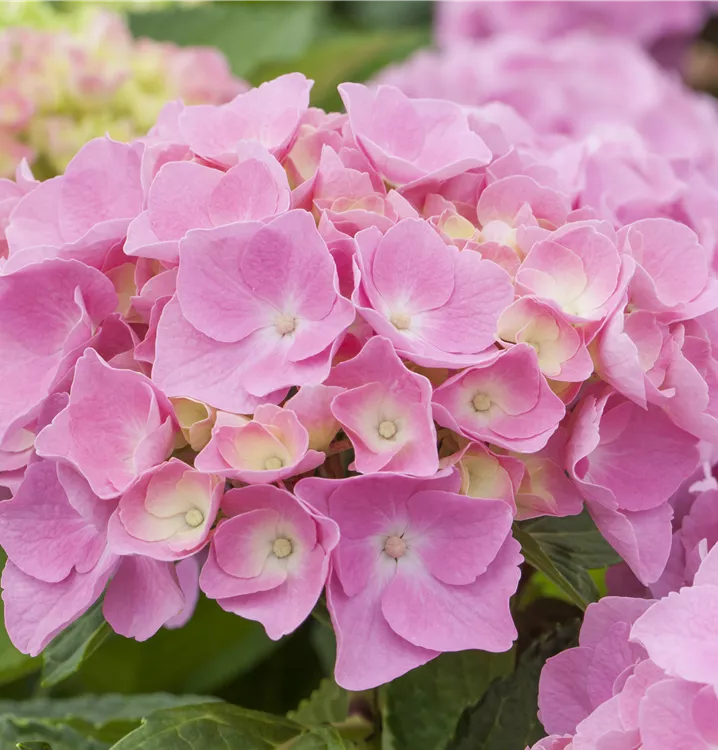 Die blauen, rosafarbenen, roten, weißen, schalenförmigen Blüten der Bauernhortensie 'Forever & Ever'® erscheinen in Dolden von Juni bis Oktober.